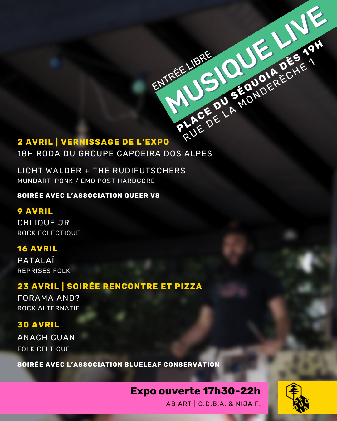 La place du Séquoia ouvre tous les jeudis de mars à juin et de septembre à novembre, de 17h30 à 22h (20h en cas de pluie). Tous les jeudis, la scène permet à un-e artiste de la région de jouer sa musique pour le public du Séquoia.