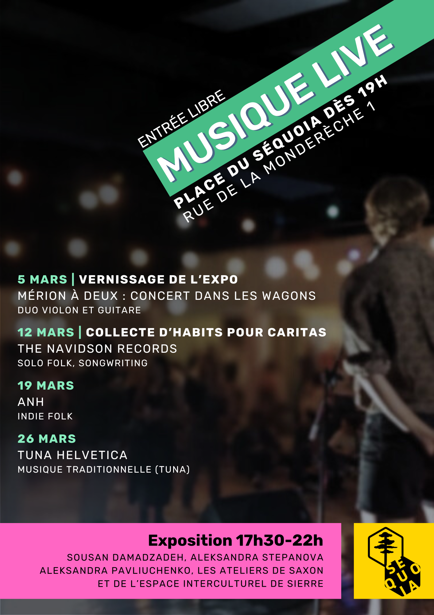 La place du Séquoia ouvre tous les jeudis de mars à juin et de septembre à novembre, de 17h30 à 22h (20h en cas de pluie). Tous les jeudis, la scène permet à un-e artiste de la région de jouer sa musique pour le public du Séquoia.